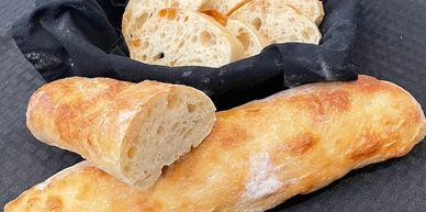 This fresh made rustic artisan bread is sure to compliment your next meal with its chewy texture and airy crumb. Ciabatta tastes best served warm and is great for making sandwiches or dipping in your favorite olive oil or sauce.